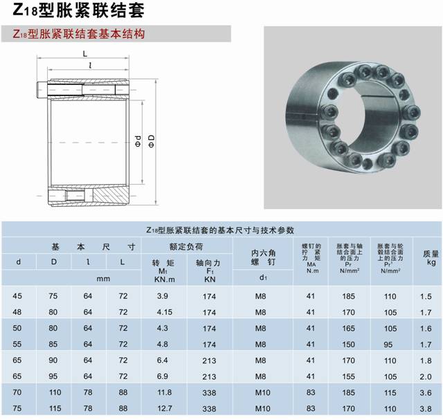 型號(hào):Z18型脹套脹套能把較大配合間隙的軸轂結(jié)合起來,拆卸時(shí)將螺栓擰松,即可使被聯(lián)結(jié)件容易拆開。脹緊時(shí),接觸面緊密億貼合不銹蝕,也便于拆開。