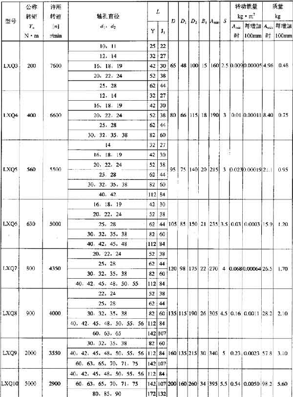 LXQ接中間軸球鉸型星形彈性聯軸器基本性能參數和主要尺寸: